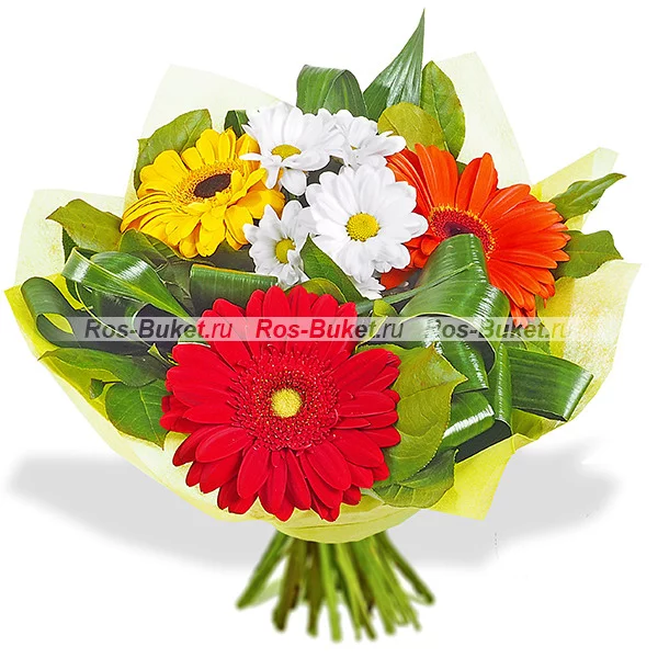 Гербера желтая - 1 шт., гербера красная - 1 шт., гербера оранжевая - 1 шт., хризантема белая кустовая - 1 шт., салал - 2 шт., аспидистра - 3 шт., ферт желтый.
